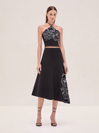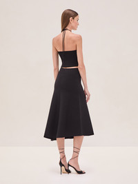 The Relle Top is a knit halter design featuring sequin detailing, paired with the Maris Skirt. Model Measurements Height: 5'10" Bust: 34B Waist: 25" Hips: 35” Model wears an XS