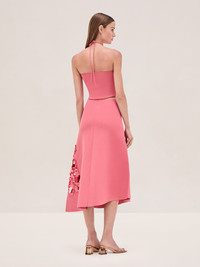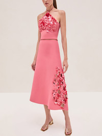 The Relle Top is a knit halter design featuring sequin detailing, paired with the Maris Skirt. Model Measurements Height: 5'10" Bust: 34B Waist: 25" Hips: 35” Model wears an XS