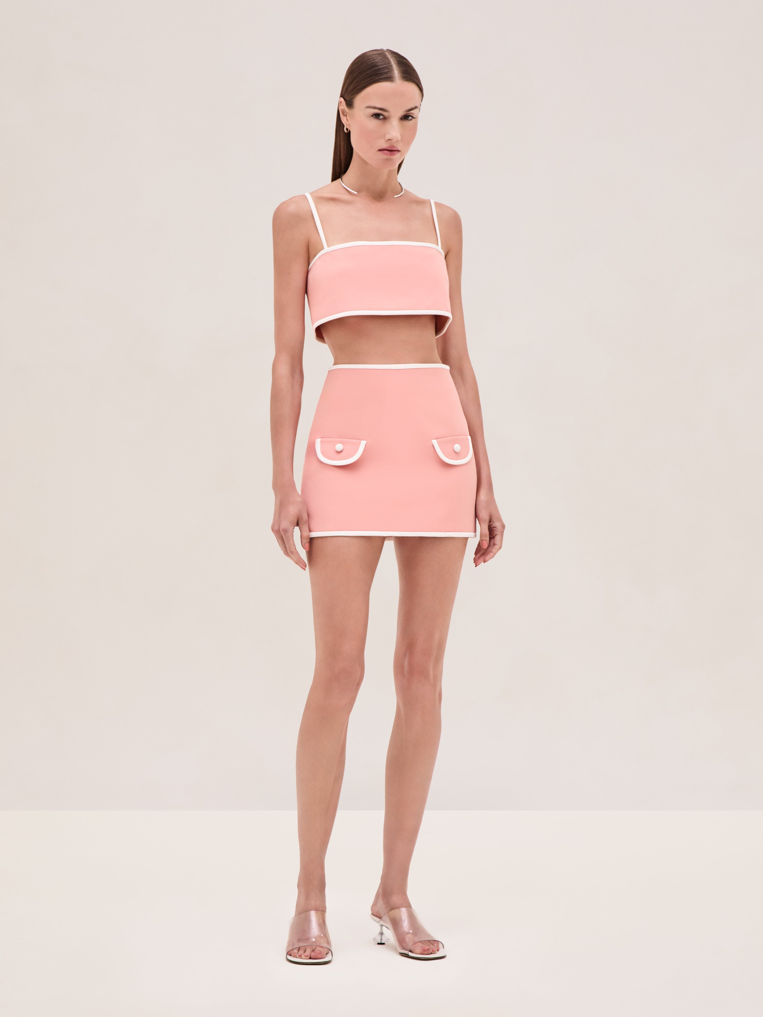 The Simi Top is a structured crop top with thin straps and contrast piping, paired with the Rubino Skirt. Model Measurements Height: 5'10" Bust: 34B Waist: 25" Hips: 35” Model wears an XS