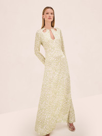 The Skyla Dress is a long sleeve column silhouette featuring keyhole cutouts and an abstract print. Model Measurements Height: 5'10" Bust: 34B Waist: 25" Hips: 35” Model wears an XS