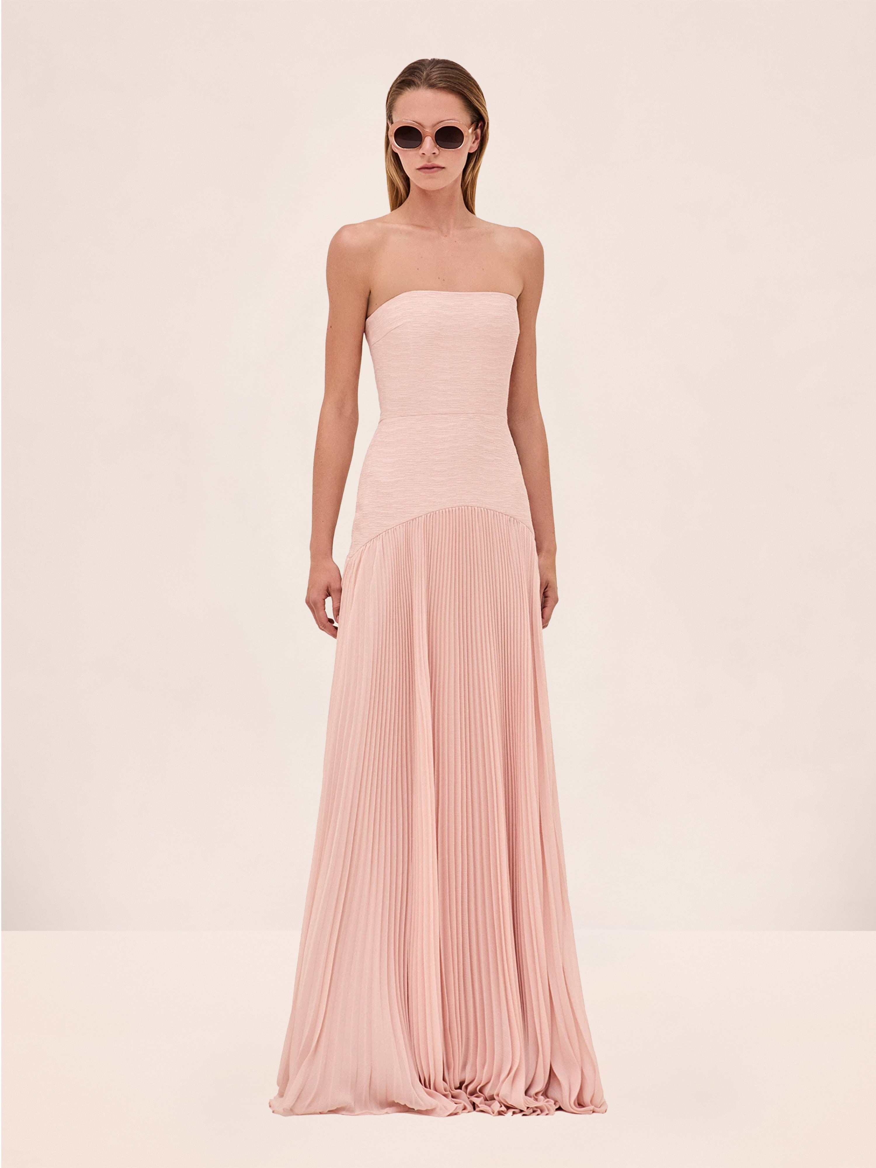 The Sunniva Dress is strapless gown with a fitted bodice and a floor-length pleated skirt. Model Measurements Height: 5'10" Bust: 34B Waist: 25" Hips: 35” Model wears an XS