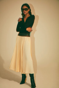 Introducing the Tansia Skirt, your new statement piece. This skirt is all about making an impact with its high slit and flowy pleats that move beautifully with every step. The wide waistband adds a touch of structure, while the soft, ethereal fabric brings an air of effortless elegance. Pair it with a the Revel top for a bold, edgy look or keep it casual with the Hayes Cardigan. We recommend sizing down if you want it to fit at the waist as it sits at the low hip by design. Model Measurements Height: 5'10" Bust: 34B Waist: 25" Hips: 35” Model wears an XS