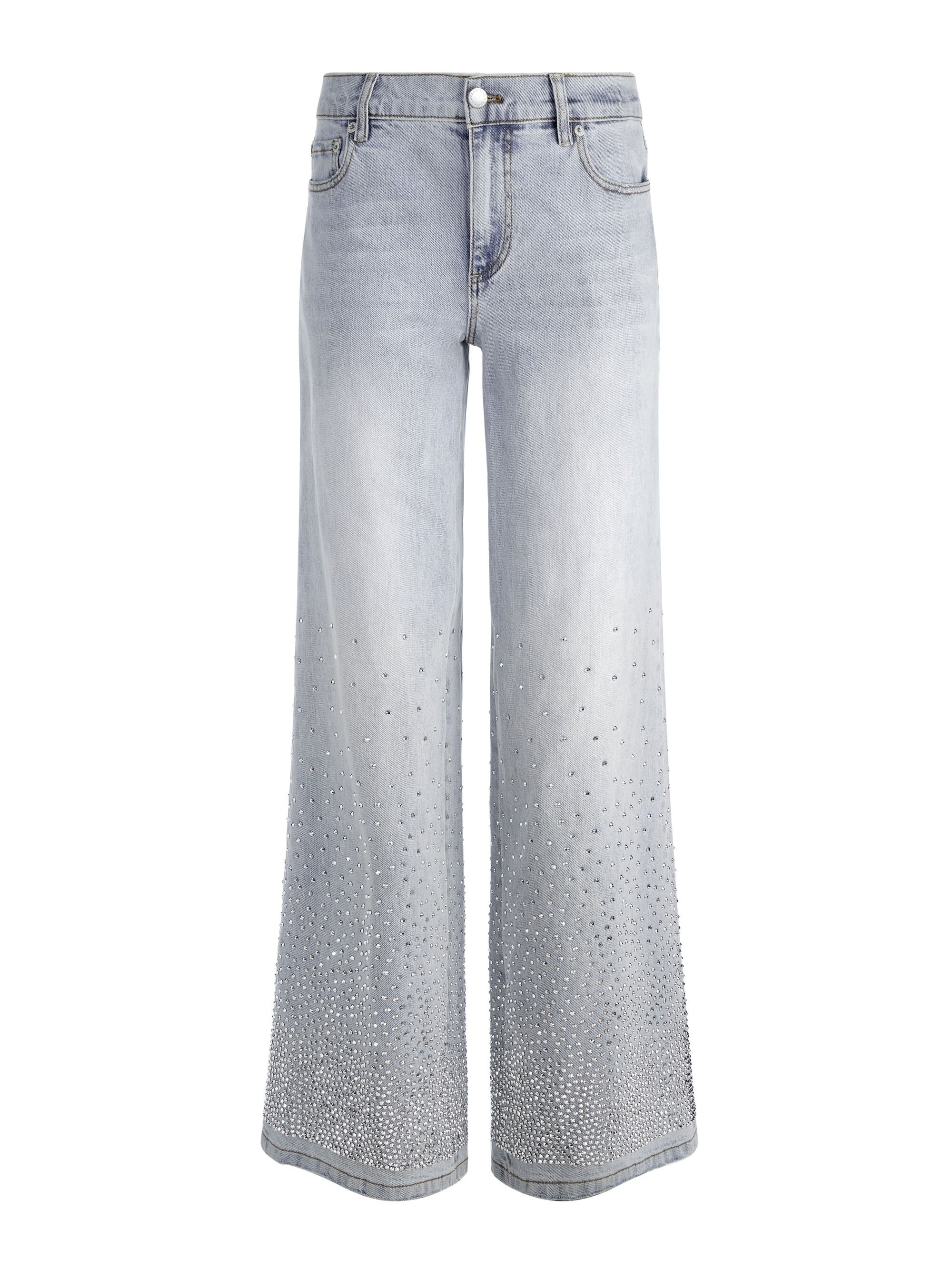 Introducing: The Amazing Embellished Jean. Low rise. Wide leg. Major personality. The Amazing Jean perfects the baggy silhouette with stretchy cotton that drapes just right and feels better with every wear. Shimmering heat-set crystals scattered throughout amp things up to rockstar status. Wear it slouchy, style it sleek-either way, you'll look AMAZING. DETAILS - Baggy jean - Low rise - Wide leg - Embellished heat set crystals on denim - Belt loops - Front button and zipper closure - 98% cotton, 2% elastane - Dry clean only - Imported FIT - Model is 5'10" and wearing a size 24 - Front rise: 9 1/8" - Inseam: 34 1/2" - Fits true to size, take your normal size