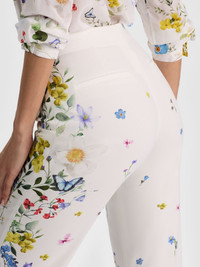 These bootcut printed pants are cut from a lightweight satin back crepe, offering a slim fit that subtly flares at the hem for a flattering, leg-lengthening effect. The clean front closure keeps the look sharp and tailored, while the high-impact blooms give it feminine dimension. DETAILS - Bootcut pant - Floral printed lightweight crepe - Slim fit - Mid rise - Hidden front hook and zipper closure - 64% recycled polyester, 33% polyester, 3% elastane - Dry clean only - Imported FIT - Model is 5'10" and wearing a size 0 - Front rise: 9 1/4" - Inseam: 31" - Fits true to size, take your normal size