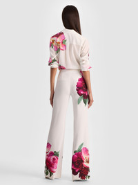 These mid-rise slim pants are cut from lightweight floral crepe, offering a slim fit that subtly flares at the hem for a flattering, leg-lengthening effect. The clean front closure keeps the look sharp and tailored while the high-impact blooms give it feminine dimension. Pair them with their matching Denny blazer for a high-impact suiting moment. DETAILS - Bootcut pant - Floral printed lightweight crepe - Slim fit - Mid rise - Hidden front hook and zipper closure - 64% recycled polyester, 33% polyester, 3% elastane - Dry clean only - Imported FIT - Model is 5'10" and wearing a size 0 - Front rise: 9 3/4" - Inseam: 35" - Fits true to size, take your normal size