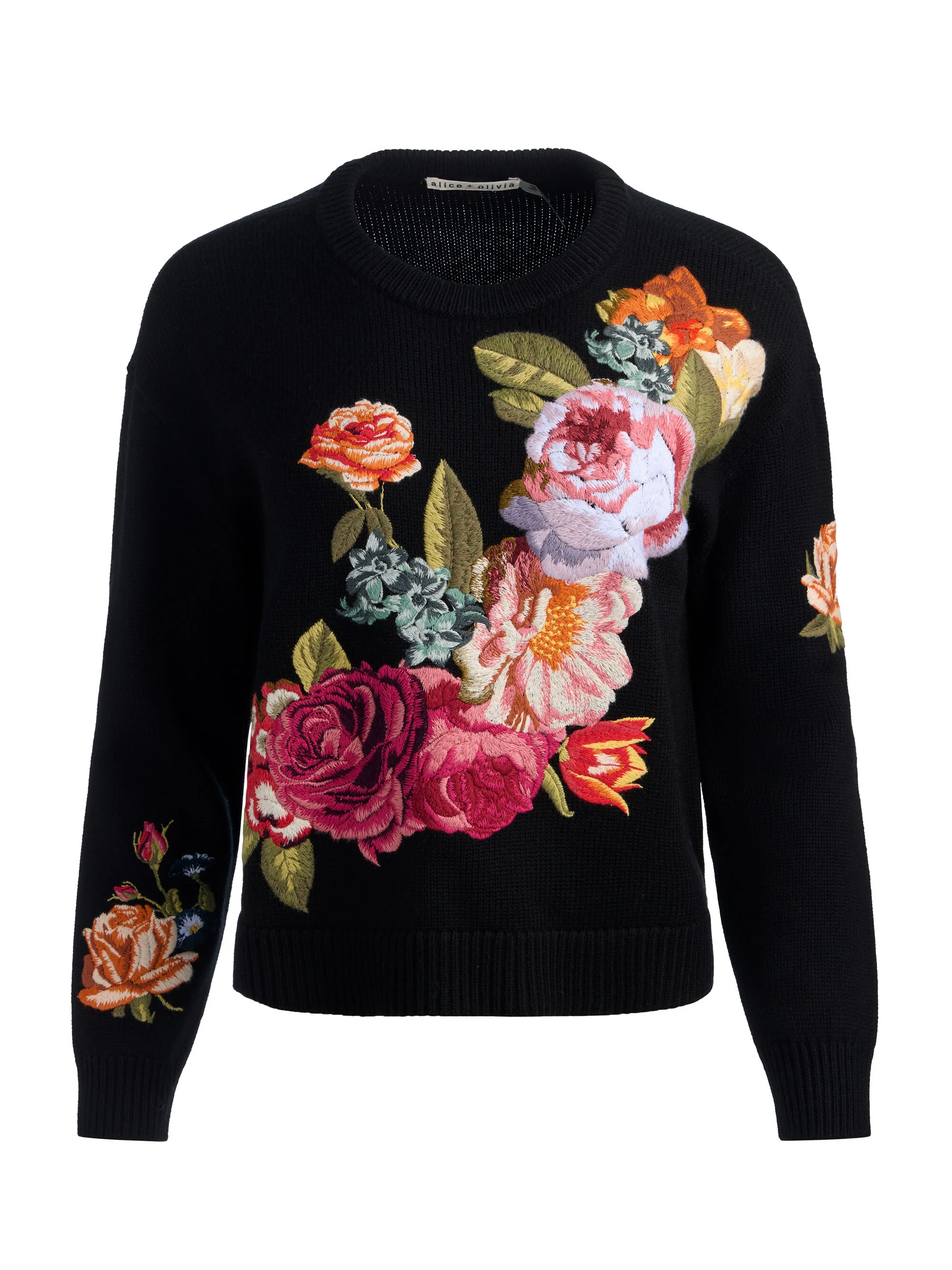 This cozy merino wool pullover gets an elevated twist with embroidered floral jacquard detailing that feels truly special. The classic crewneck silhouette makes it endlessly wearable, while the texture adds visual interest. Wear it with tailored pants for a polished daytime look or dress it down with denim for off-duty ease. DETAILS - Wool pullover - Embroidered floral jacquard - Crew neck - 100% merino wool - Dry clean only - Imported FIT - Model is 5'10" and wearing a size XS - Length from the shoulder: 23" - Fits true to size, take your normal size