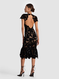 Back by popular demand: our Clover dress returns in classic black, cut from velvet lace with intricate cutouts. Its body-skimming silhouette is finished with cap sleeves, a ruffled hem, and a daring open back. It’s carefully lined throughout so the cutouts aren’t too revealing. Both romantic and sultry, it’s a guaranteed standout for evening occasions. DETAILS - Midi dress - Velvet cutwork lace - Attached lining - Cap sleeves - Ruffled hem - Open back with zipper closure - 100% polyester - Dry clean only - Imported FIT - Model is 5'10" and wearing a size 0 - Length from the shoulder: 48" - Fits true to size, take your normal size