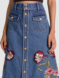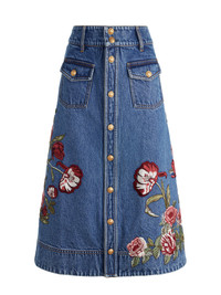 Vintage vibes, modern details. The Dahlia denim midi skirt is crafted from hand-embroidered denim and cut in an A-line silhouette that’s polished enough for work but relaxed enough for weekends. A piece that makes a statement while remaining ultra versatile. DETAILS - Midi skirt - Embroidered denim - A-line fit - Gold button front closures - 100% cotton - Dry clean only - Imported FIT - Model is 5'10" and wearing a size 25 - Skirt length: 28 1/2" - Fits true to size, take your normal size