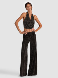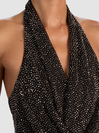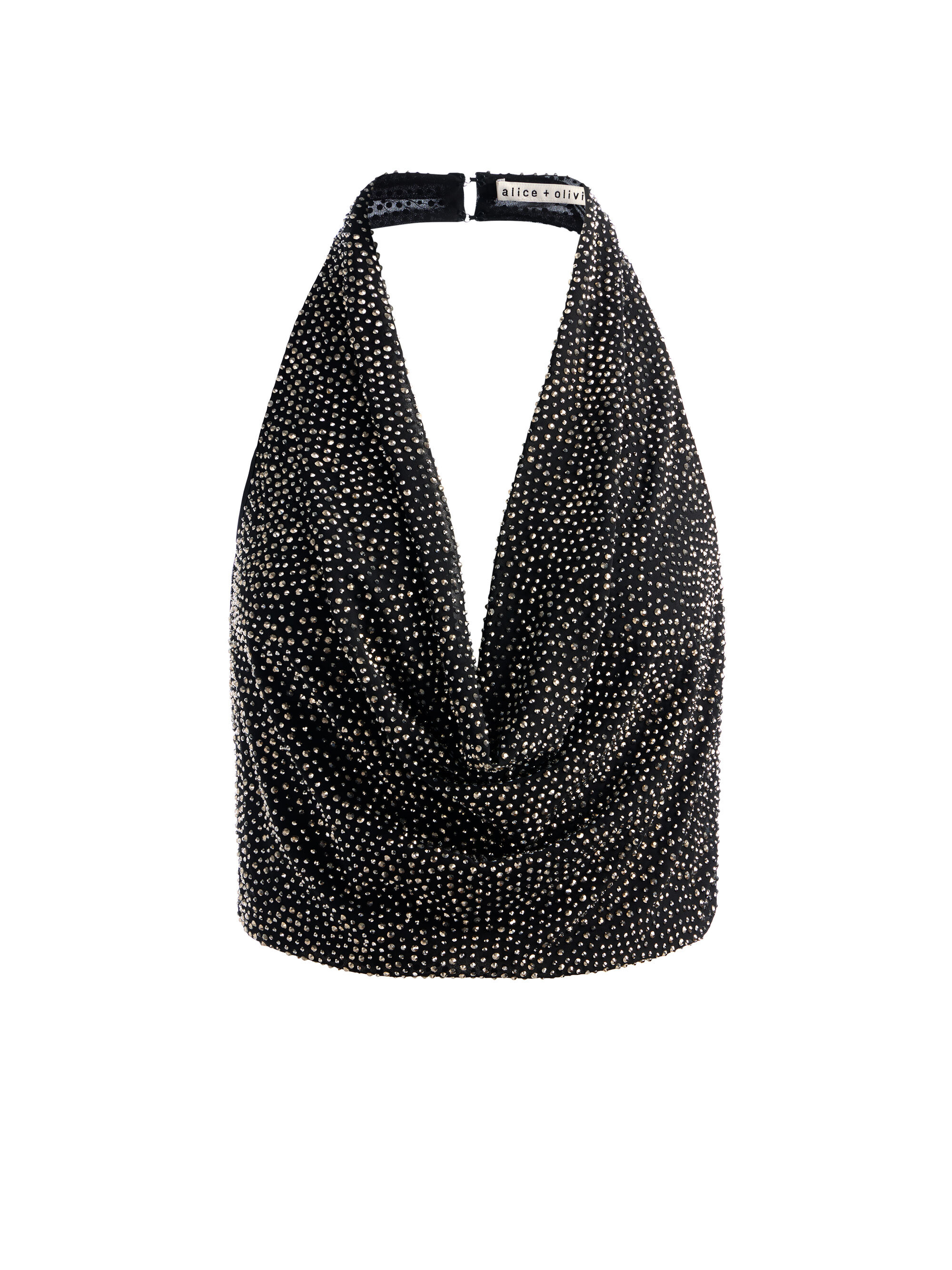 Dani is the definition of a statement top- cropped, backless, and drenched in hematite crystals silk that catch the light with every move. Hundreds of shimmering crystals have been head-set by hand on georgette silk. The dramatic cowl neckline adds a touch of glamour, while its tie-back closure keeps the mood playful. A true go-to for nights that call for sparkle (and attention). DETAILS - Halter top - Embellished hematite heat-set crystals on georgette - Cropped - Cowl neck - Open back with tie closure - 100% polyester - Dry clean only - Imported FIT - Model is 5'10" and wearing a size XS - Length from the shoulder: 17" - Fits true to size, take your normal size