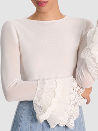 A romantic take on a layering piece. Our Delaina is a sheer mesh crop top with long sleeves, a lined bodice, and ruffled cuffs that feel like built-in accessories. Slim and simple, but with just enough whimsy, it instantly elevates denim or looks ethereal layered under blazers. Major Victorian vibes! DETAILS - Mesh crop top - Lined bodice - Sheer sleeves - Ruffled lace cuffs - Back zipper closure - 92% polyester, 8% elastane - Dry clean only - Imported FIT - Model is 5'10" and wearing a size XS - Length from the shoulder: 19 1/2" - Fits true to size, take your normal size