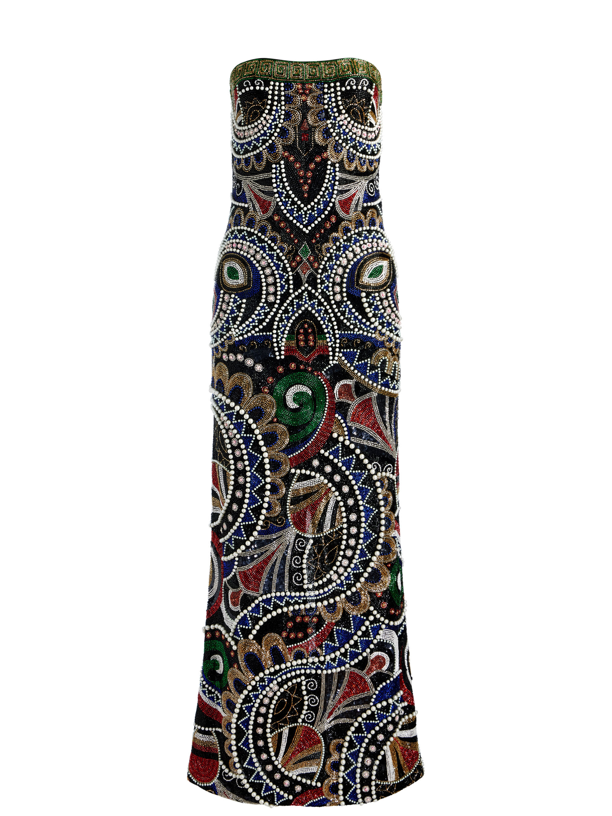 The Delora gown stuns in a strapless, body-skimming silhouette, drenched in elaborate beadwork that shimmers with every step. Pearls, sequins, and colorful seed beads create a mesmerizing mosaic across the black base-ornate, opulent, and completely unforgettable. Trust us, this is your show-stopping moment. DETAILS - Maxi gown - Embroidered mesh - Bodycon fit - Strapless - Back zipper closure - 91% nylon, 9% elastane - Dry clean only - Imported FIT - Model is 5'10" and wearing a size 0 - Length from the shoulder: 59 1/2" - Fits true to size, take your normal size