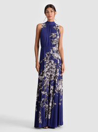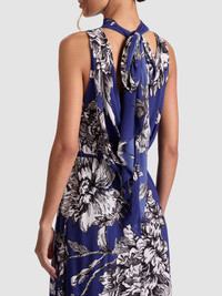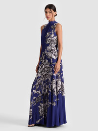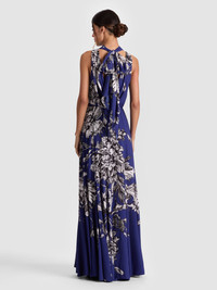 A showstopper in motion. The Dita is crafted in flowing viscose with a pleated godet skirt and a dramatic open cowl back that ties at the nape of the neck. The tie can be styled multiple ways-loose and draped or snug and secure-for your preferred level of reveal. Printed in blooming wild indigo, this one brings soft drama and endless twirl to summer nights. DETAILS - Maxi dress - High neck with back tie closure - Open cowl back - Pleated godets - Hidden side zipper closure - 100% viscose - Dry clean only - Imported FIT - Model is 5'10" and wearing a size 0 - Length from the shoulder: 59" - Fits true to size, take your normal size