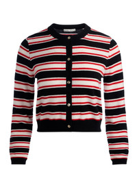 We created our perfect red striped cardigan, in crazy soft cashmere with a shrunken silhouette for the most flattering fit and comfortable feel. The perfect combination of statement piece and capsule closet hero. DETAILS - Striped cashmere cardigan - Cropped - Long sleeve - Crew neck - Front button closures - 100% cashmere - Dry clean only - Imported FIT - Model is 5'10" and wearing a size Small - Length from the shoulder: 18 1/2" - Meant for a shrunken fit, size up for a less fitted look