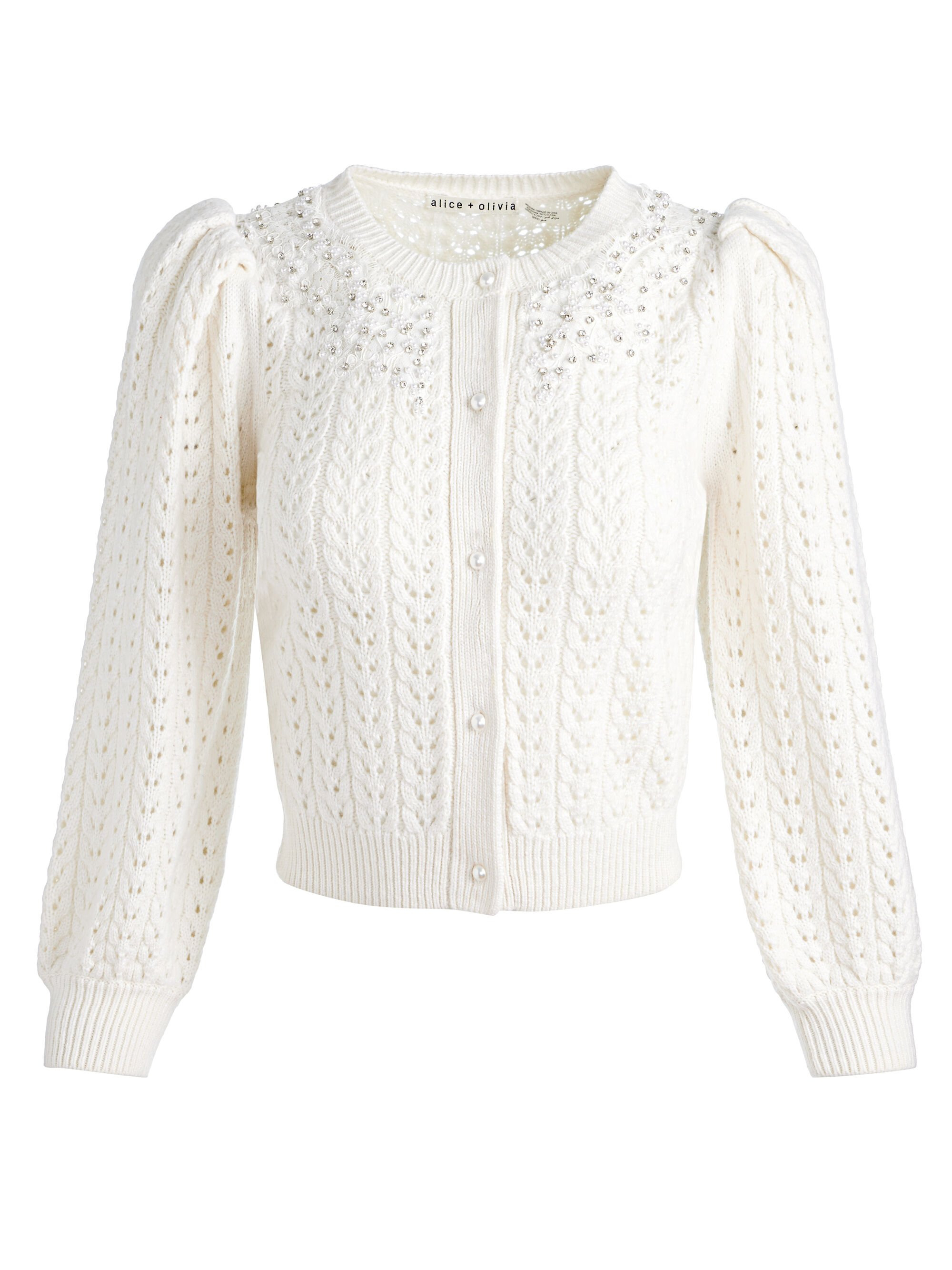 Delicate and feminine with just a hint of prep, Doris is the puff sleeve cardigan you didn’t know you needed. Designed in a luxe merino wool blend with pearl buttons and a subtly embellished neckline, it's the perfect elevated staple. The shrunken fit adds a modern edge to an otherwise vintage-inspired silhouette. DETAILS - Wool cardigan - Pointelle stitch - Embellished neckline - Puffed sleeves - Pearl buttons - Shrunken fit - 78% merino wool, 10% nylon, 3% elastane - Dry clean only - Imported FIT - Model is 5'10" and wearing a size XS - Length from the shoulder: 19" - Fits true to size, take your normal size