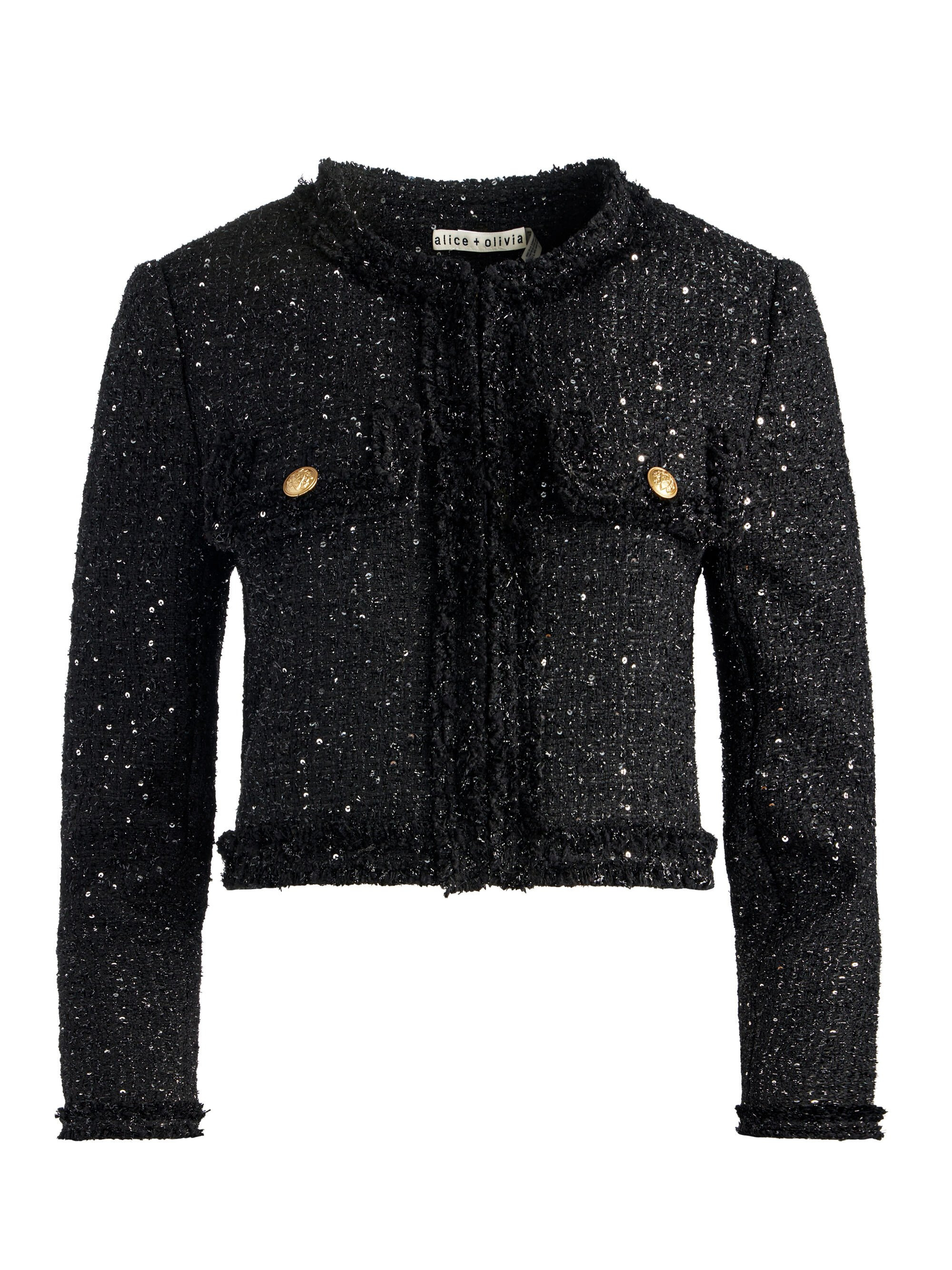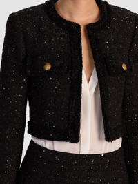 Preppy perfection. The Dumont jacket is crafted in textured black tweed with embellished sequins for some added shine. The slightly boxy fit keeps things cool, while the cropped construction makes it perfect for pairing with feminine skirts, denim or mini dresses alike. DETAILS - Cropped jacket - Tonal shine tweed - Boxy fit - Strong shoulders - Front hook closures - 100% polyester - Dry clean only - Imported FIT - Model is 5'10" and wearing a size 0 - Length from the shoulder: 17" - Fits true to size, take your normal size