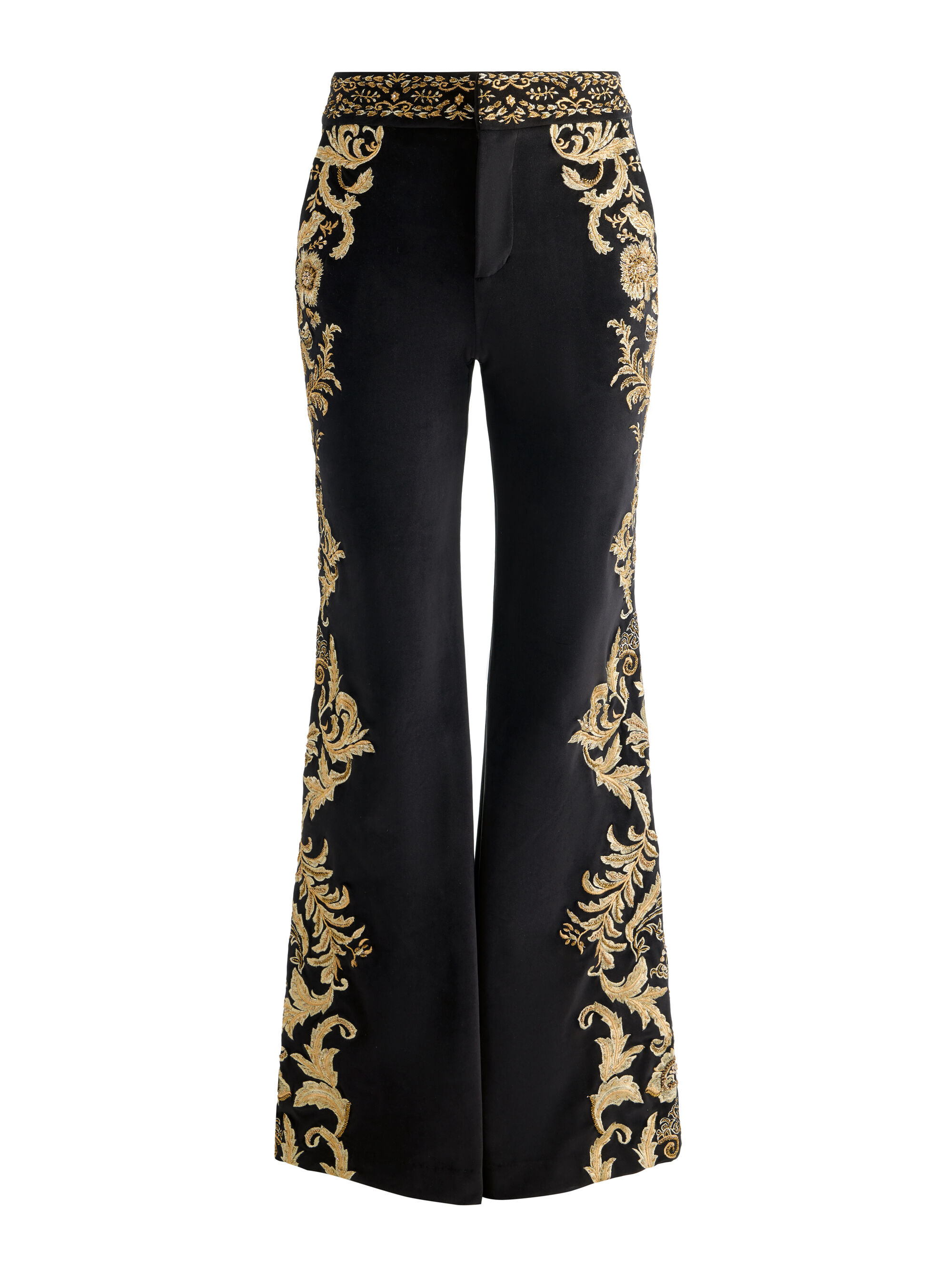 Sleek and modern with a playful twist, our Dylan pants are the perfect balance of structure and ease. Featuring a flattering high waist and elegant brocade print on stretch velvet, they visually elongate the legs while offering all-day comfort. Their wide-legged, relaxed fit adds effortless movement, making them as versatile as they are stylish. Whether dressed up with a tailored blazer or paired with a simple tank for a casual-chic vibe, these pants are a standout piece for any wardrobe. DETAILS - Wide leg pant - Gold embroidery on matte stretch velvet - High rise - Front hook and zipper closure - 90% polyester, 10% elastane - Dry clean only - Imported FIT - Model is 5'10" and wearing a size 0 - Front rise: 11 1/4" - Inseam: 35 1/4" - Fits true to size, take your normal size