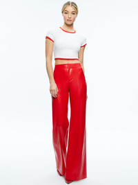 This vegan leather trouser is our dream pant - ideal for taking your pants game to a new level. With an of-the-moment bright ruby shade, wide leg, and high waist, it's incredibly flattering. DETAILS - High waist - Pintuck pleat at front leg - Hidden hook and eye and zipper closure - Fully lined - Outer: 100% polyurethane (vegan leather) - Lining: 100% polyester - Dry clean only - Imported FIT - Front rise: 11” - Back rise: 15 5/8” - Inseam: 35 1/4” - Fits true to size, take your normal size - Model is wearing a size 2 and her measurements are 5'9.5", 31" bust, 23" waist, 34.5" hip