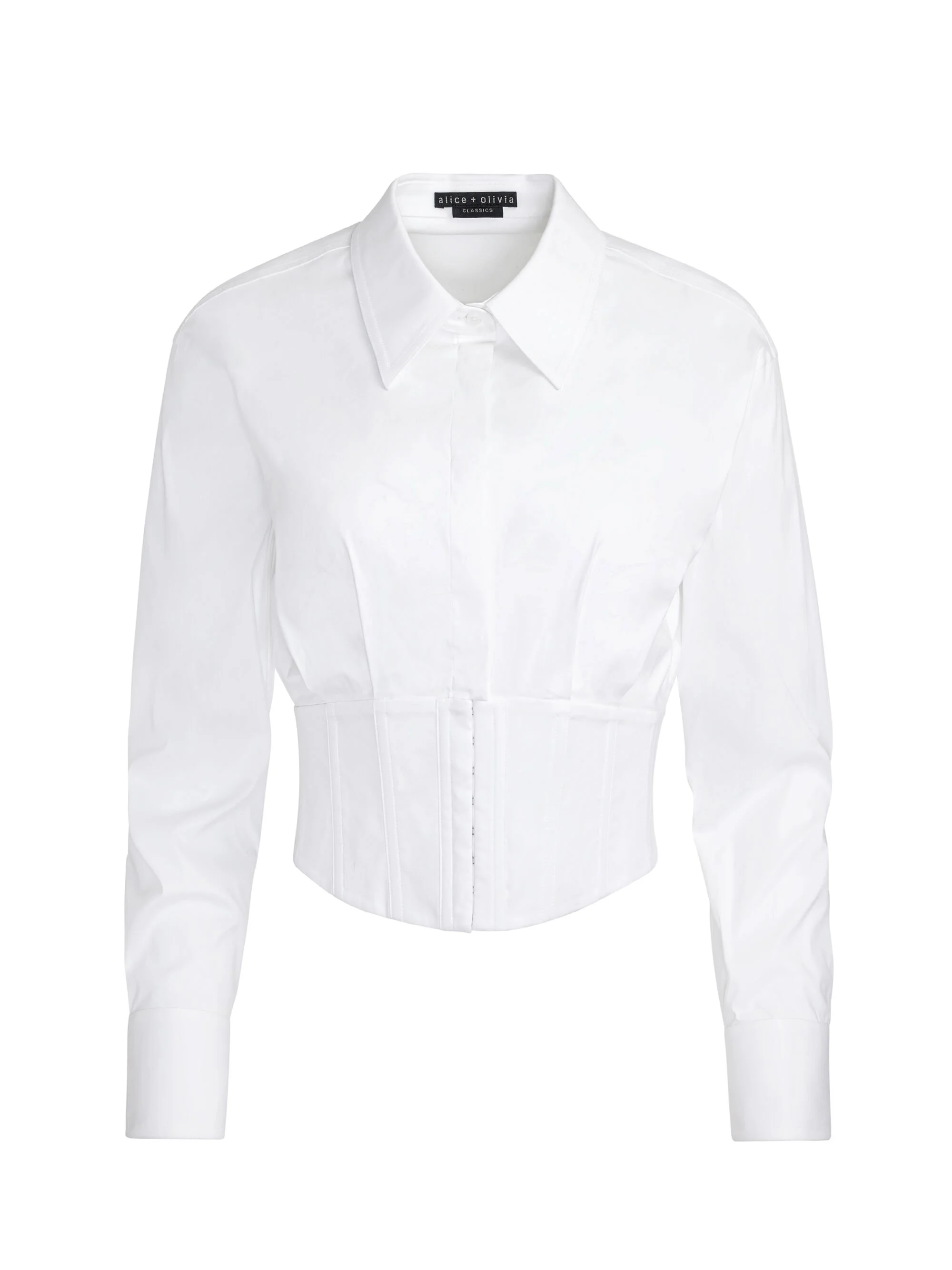 A classic button-down--reimagined and refined. The Edie takes menswear cues and turns them into something unmistakably feminine, pairing a crisp traditional shirt with a sculpted, waist-defining corset. Boning and hook-and-eye closures carve out a flattering, cinched silhouette that feels both tailored and modern. Surprisingly versatile, it’s the kind of piece you can style with everything from relaxed denim to a sharp mini. DETAILS - Cropped button down - Corset waist with hook closures - Hidden placket - Back smocking - 73% cotton, 24% nylon, 3% elastane - Dry clean only - Imported FIT - Model is 5'10" and wearing a size 0 - Length from the shoulder: 18" - Fits true to size, take your normal size