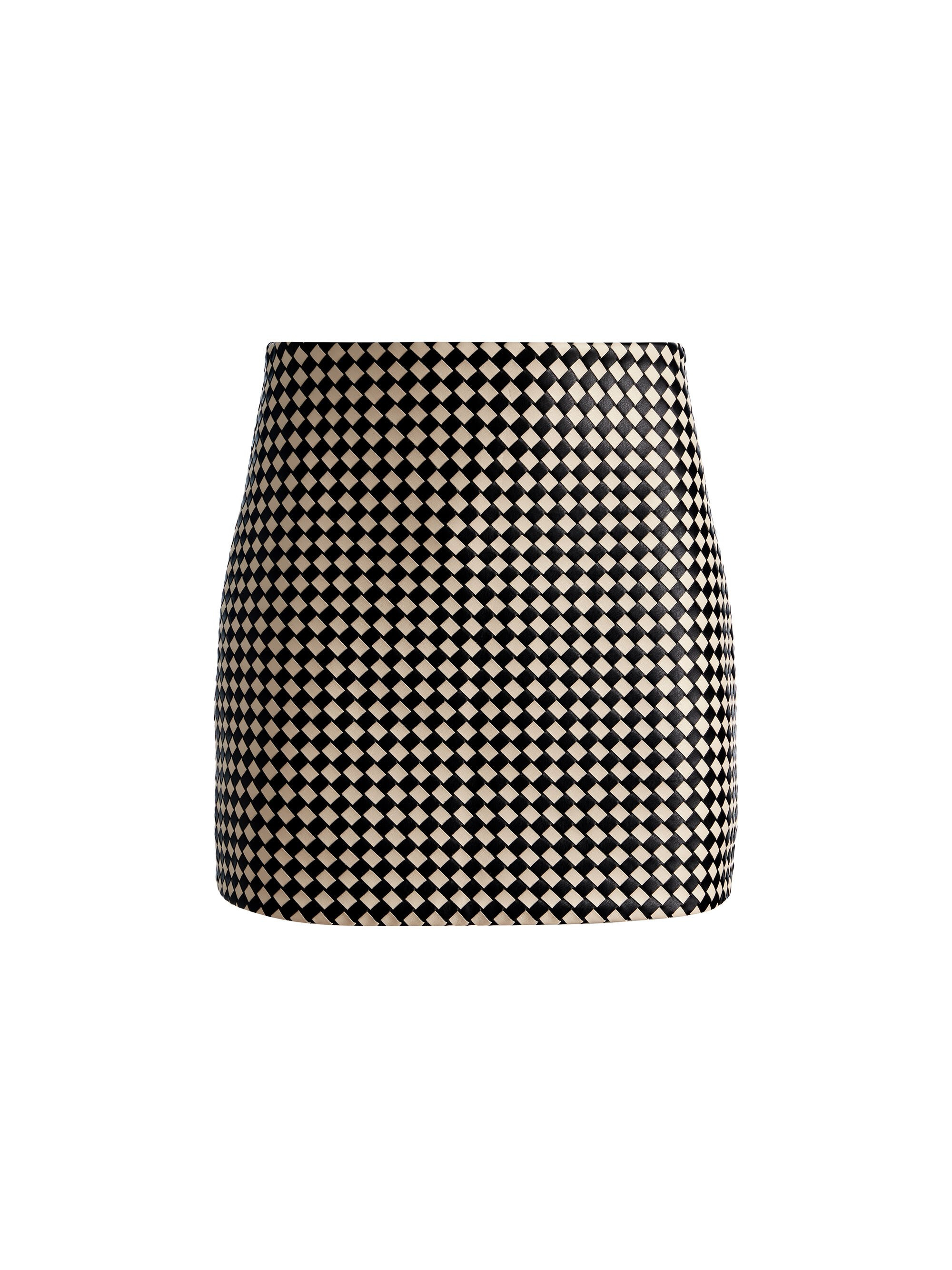The it-girl mini, reimagined. The Elana skirt is made from lasercut strips of alternating vegan leather, woven together to create a basketweave look. Wear it with the matching Logan coat for an ultra-polished twinset, or pair it with a baby tee and sneakers for off-duty TK vibes. DETAILS - Mini skirt - Woven vegan leather - Back zipper closure - 100% polyurethane - Dry clean only - Imported FIT - Model is 5'10" and wearing a size 0 - Skirt length: 14" - Fits true to size, take your normal size