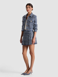 A mini with main character energy. The Emilie skirt is tailored in textured denim tweed with crisp box pleats, frayed edges, and a flirty fit that hits mid-thigh. Wear it with the matching Chloe jacket for a perfectly preppy pairing-or with a cropped cardi and sneakers for your next summer crush. DETAILS - Mini skirt - Textured denim tweed - Frayed hem - Box pleats - Back zipper closure - 89% polyester, 11% viscose - Dry clean only - Imported FIT - Model is 5'10" and wearing a size 0 - Skirt length: 14 3/4" - Fits true to size, take your normal size