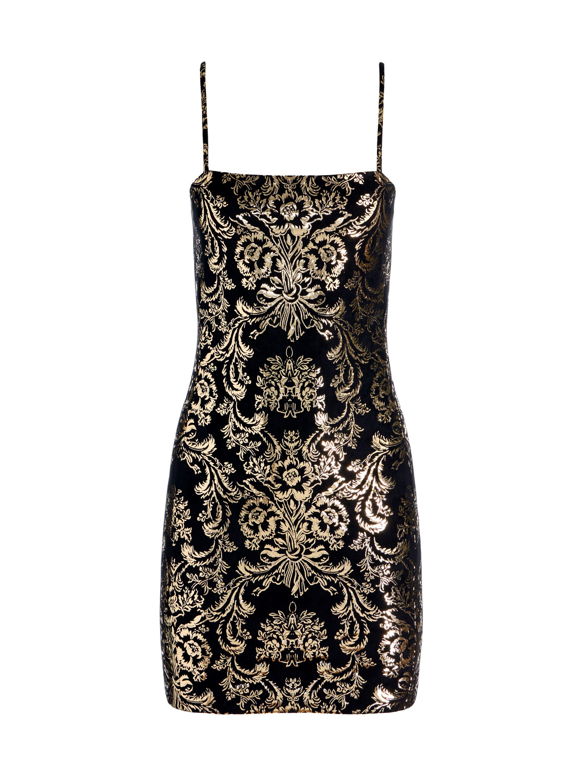 Fifi is the ultimate party dress with a bodycon fit and metallic brocade foil that glimmers against vegan suede. Slim straps and a sleek silhouette keep it minimal, while the shimmering surface makes it unforgettable. Perfect for New Year’s Eve or any night where shine is required, this little dress is made to turn heads. Pair with barely-there sandals to let it truly shine. DETAILS - Mini dress - Metallic brocade foil on vegan suede - Bodycon fit - Back zipper closure - 90% polyester, 10% elastane - Dry clean only - Imported FIT - Model is 5'10" and wearing a size 0 - Length from the shoulder: 32 1/2" - Fits true to size, take your normal size