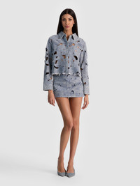 A denim button down shirt with attitude. Finely features laser-cut eyelet details, an oversized, cropped fit, and a distressed hem that makes it feel lived-in from the first wear. It’s bold, airy, and unexpectedly versatile. Style it with the matching Chic jean for a modern take on the Canadian tuxedo or throw it over a slip dress as a jean jacket. DETAILS - Cropped button down - Laser-cut denim - Oversized fit - Distressed hem - 100% cotton - Dry clean only - Imported FIT - Model is 5'10" and wearing a size XS - Length from the shoulder: 20" - Fits true to size, take your normal size