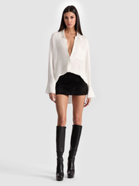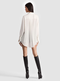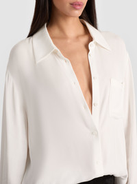 The throw-on-and-go shirt of your dreams. Our Finely off white button down is intentionally oversized for a borrowed-from-the-boys, effortless feel. Crafted from double viscose for extra softness, it features exaggerated cuffs, a long-line hem, and a relaxed drape that works tucked or untucked. Wear it solo, over denim, or layered open over a tank- it's just that versatile. DETAILS - Button down - Double viscose - Oversized fit - Collared - Front button closure - 100% viscose - Dry clean only - Imported FIT - Model is 5'10" and wearing a size XS - Length from the shoulder: 31 1/8" - Runs large, size down for a slimmer fit