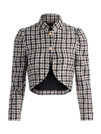 The Ilaria plaid cropped jacket is distinguished by its intricately woven black and white tweed, well-defined silhouette and sweet feminine details. It’s impeccably tailored from a short length, close-fitting body and sculptural puff shoulders. Rounded hemlines expose a sliver of stomach while an elevated mock neck finishes the look. DETAILS - Cropped jacket - Metallic tweed - Mock neck - Puffed shoulders - Front button closures - 79% acrylic, 21% polyester - Dry clean only - Imported FIT - Model is 5'10" and wearing a size XS - Length from the shoulder: 16" - Fits true to size, take your normal size