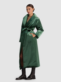 Designed in an eye-catching shade of green velvet, this coat turns cold weather into a style moment. It features a shawl collar, adjustable tie waist, and a long, cozy silhouette that's fully lined for comfort. Whoever said layers have to be boring clearly hasn’t met this one - you're not going to want to take it off. DETAILS - Puffer coat - Velvet - Maxi length - Adjustable tie waist - 88% polyester, 12% elastane - Dry clean only - Imported FIT - Model is 5'10" and wearing a size XS - Length from the shoulder: 52" - Fits true to size, take your normal size