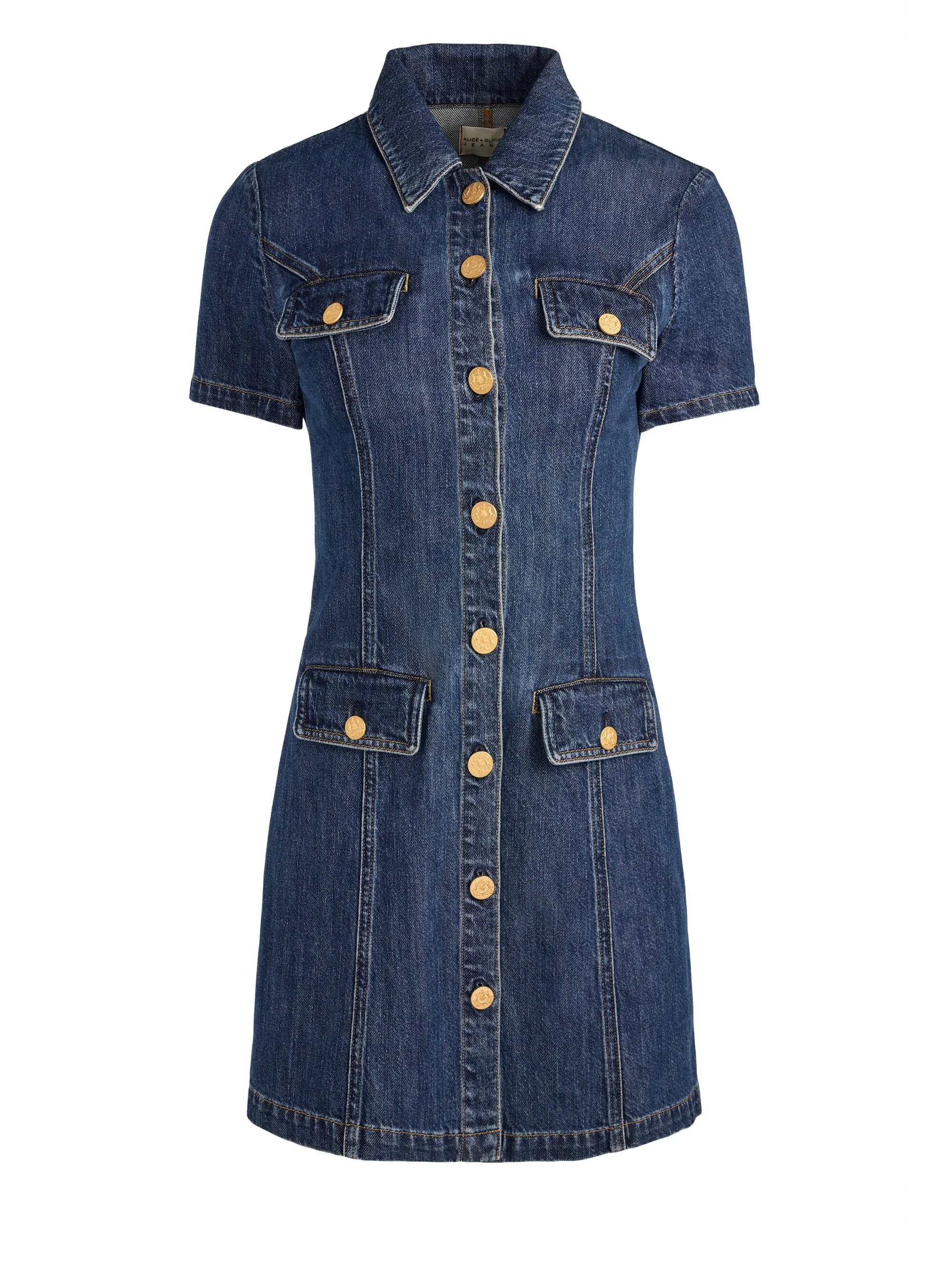 Classic denim, reimagined with a tailored twist. The Jamie dress features an A-line silhouette and collared neckline, finished with curved seams that subtly shape the waist and create a flattering hourglass effect. Its medium wash is versatile, making it the kind of piece you can style endless ways--bare-legged with heels, layered under a jacket, or paired with tights and tall boots. Effortless and endlessly wearable, it's your new everyday icon. DETAILS - Denim mini shirtdress - A-line - Collared - Gold front button closures - 100% cotton - Dry clean only - Imported FIT - Model is 5'10" and wearing a size 0 - Length from the shoulder: 33" - Fits true to size, take your normal size
