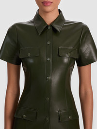 Classic vegan leather, reimagined with a tailored twist. The Jamie dress features an A-line silhouette and collared neckline, finished with curved seams that subtly shape the waist and create a flattering hourglass effect. Its cut in a dark olive hue, making it the kind of piece you'll want to wear all fall and winter. Effortless and endlessly wearable, it's your new everyday icon. DETAILS - Vegan leather mini shirtdress - A-line - Collared - Front snap closures - 100% polyurethane - Dry clean only - Imported FIT - Model is 5'10" and wearing a size 0 - Length from the shoulder: 33" - Fits true to size, take your normal size