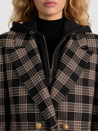 Two looks in one. Jordan’s sharp, double?breasted tailoring means business-until you zip in the heather?grey hoodie insert and suddenly it’s weekend?ready streetwear. Detach the hood for boardroom polish; and snap it back on for coffee runs, concerts, and everything after hours. Consider it your versatile power piece for fall. DETAILS - Hooded blazer - Stretch viscose - Double breasted - Strong shoulders - Removable hoodie - Front button closure - 65% recycled polyester, 32% viscose, 3% elastane - Dry clean only - Imported FIT - Model is 5'10" and wearing a size XS - Length from the shoulder: 28 1/2" - Fits true to size, take your normal size