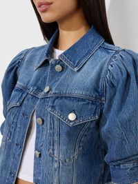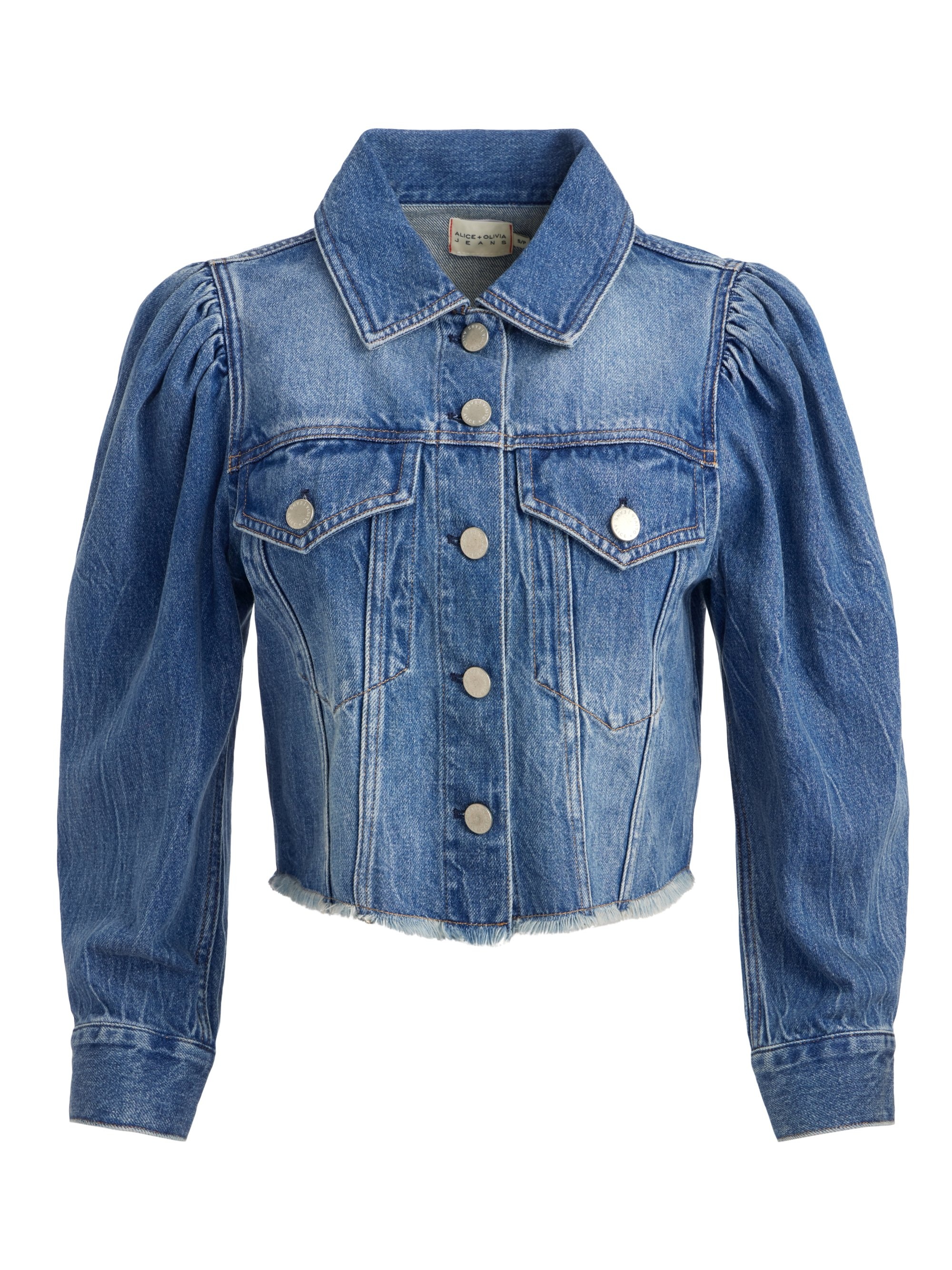 We left the hem of this cropped denim jacket intentionally raw for a look that feels like it has just enough edge. It includes a puffed shoulder, 3/4 length sleeve, and buttons up the front. DETAILS - Denim jacket - Cropped - Puffed long sleeves - Collared - Raw hem - Button front closure - 100% cotton - Turn inside out and machine wash on cold - Imported FIT - Model is 5'10" and wearing a size XS - Length from the shoulder: 18” - Fits true to size, take your normal size