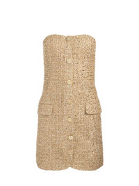 Your golden hour, in dress form. This strapless tweed mini--woven with metallic threads for a subtle sparkle--was made for holiday soirees and champagne toasts. Finished with ornate gold buttons and pocket detailing, it delivers just the right amount of festive glamour while keeping the silhouette chic and streamlined. Add heels, a clutch, and prepare for compliments. DETAILS - Mini blazer dress - Champagne sparkle tweed - Gold button closures - Strapless with inner non-slip silicone grip - Back zipper closure - 100% polyester - Dry clean only - Imported FIT - Model is 5'10" and wearing a size 0 - Length from the shoulder: 33" - Fits true to size, take your normal size