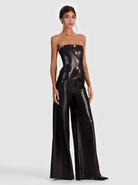 Your power piece, redefined. This strapless bustier- crafted in sleek vegan leather with blazer-inspired tailoring- was designed to command attention. Structured yet feminine, it features sharp lines, pocket detailing, and a curve-hugging fit that elevates everything from denim to matching leather. Pair it with trousers for a polished night-out look or style it solo with a skirt when the dress code calls for bold sophistication. DETAILS - Vegan bustier top - Printed matte satin crepe - Strapless with non-slip inner silicone grip - Gold button closures - Lined - Back zipper closure - 100% polyurethane - Dry clean only - Imported FIT - Model is 5'10" and wearing a size 0 - Length from the shoulder: 22 1/2" - Fits true to size, take your normal size