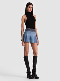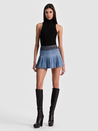 The ultimate throw-on-and-go mini. The Mera Skirt is pleated to perfection in crisp, structured cotton denim with an A-line shape that flatters every figure. It’s the kind of piece that works with everything from oversized sweaters to bikini tops and always brings a hint of prep with that mixed media tweed. DETAILS - Mini skirt - Denim - Low rise - Pleated - Tweed waistband - Back zipper closure - 100% cotton - Dry clean only - Imported FIT - Model is 5'10" and wearing a size 25 - Skirt length: 13 1/2" - Fits true to size, take your normal size