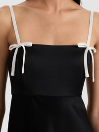 Playful but polished. The Morgan dress takes a classic babydoll silhouette and elevates it in recycled satin-back crepe with A-line volume and delicate bow straps. The result? A feel-good mini that works for warm nights, weekend brunches, and everything in between. It’s giving TK, with a grown-up glow-up. DETAILS - Mini babydoll dress - Recycled satin back crepe - Bow detail straps - A-line skirt - Back zipper closure - 62% recycled polyester, 36% polyester, 2% elastane - Dry clean only - Imported FIT - Model is 5'10" and wearing a size 0 - Length from the shoulder: 33" - Fits true to size, take your normal size
