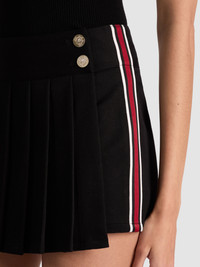 A preppy essential with unexpected detail. The Noah mini is cut in twill sateen with a box-pleated flap overlay, secured by gold buttons for a faux-wrap effect. Flirty and tailored, it plays nicely with crisp shirts or soft knits-and promises maximum mileage for all your summer prep moments. DETAILS - Mini skirt - Twill sateen - Pleated wrap front with gold button closures - Shorts in back - Side stripe - Back zipper closure - 64% polyester, 32% viscose, 4% elastane - Dry clean only - Imported FIT - Model is 5'10" and wearing a size 0 - Length: 12 1/2" - Fits true to size, take your normal size