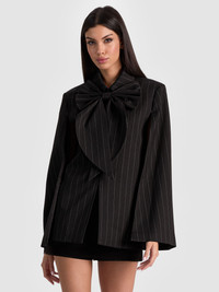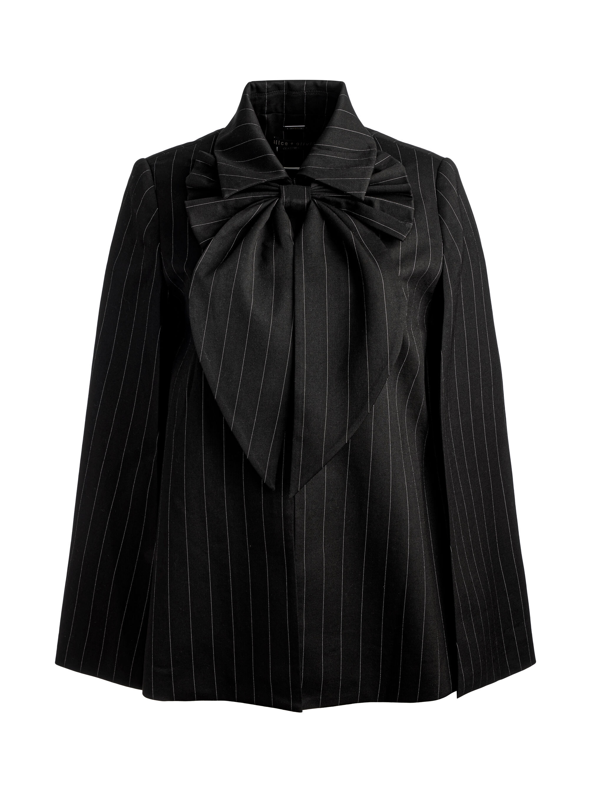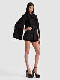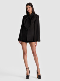 This gorgeous cape is designed with an oversized bow so it’s a total outfit-maker. We love the impact it lends to your most basic tees and trousers but also to gowns and LBDs. Wear it whenever you need to look your most gorgeous. DETAILS - Pinstriped cape - Wool stretch suiting - Cropped - Detachable bow - Arm slits - Strong shoulders - 54% polyester, 26% wool, 18% viscose, 2% elastane - Dry clean only - Imported FIT - Model is 5'10" and wearing a size XS - Length from the shoulder: 29" - Fits true to size, take your normal size