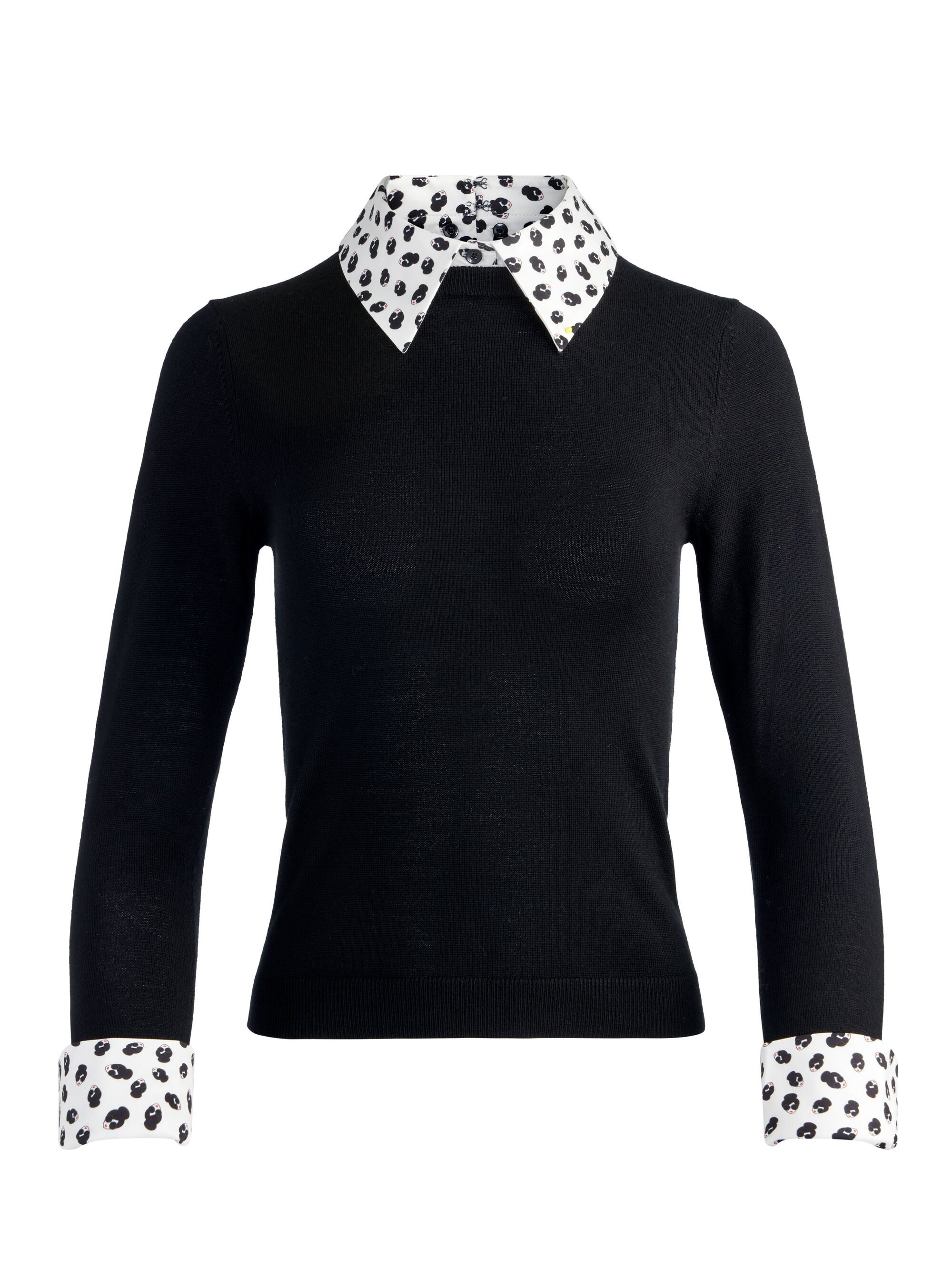At first glance, the Porla sweater is a simple, sleek black knit-clean, minimal, and crafted from soft, luxurious merino wool. But it’s more than meets the eye. Add the detachable woven collar and cuff set, and it instantly transforms into a playful, polished piece featuring our signature StaceFace icons. The removable accents bring a fun twist to the classic silhouette, letting you switch between understated and standout in seconds. With its cropped length and tailored fit, it pairs perfectly with high-rise denim or trousers. DETAILS - Wool sweater - Collared - Fitted - Detachable StaceFace collar and cuffs - Back zipper closure - 99% merino wool, 1% elastane - Dry clean only - Imported FIT - Model is 5'10" and wearing a size XS - Length from the shoulder: 21" - Fits true to size, take your normal size