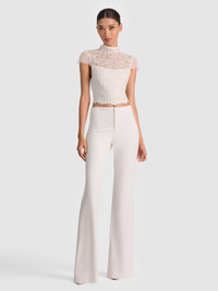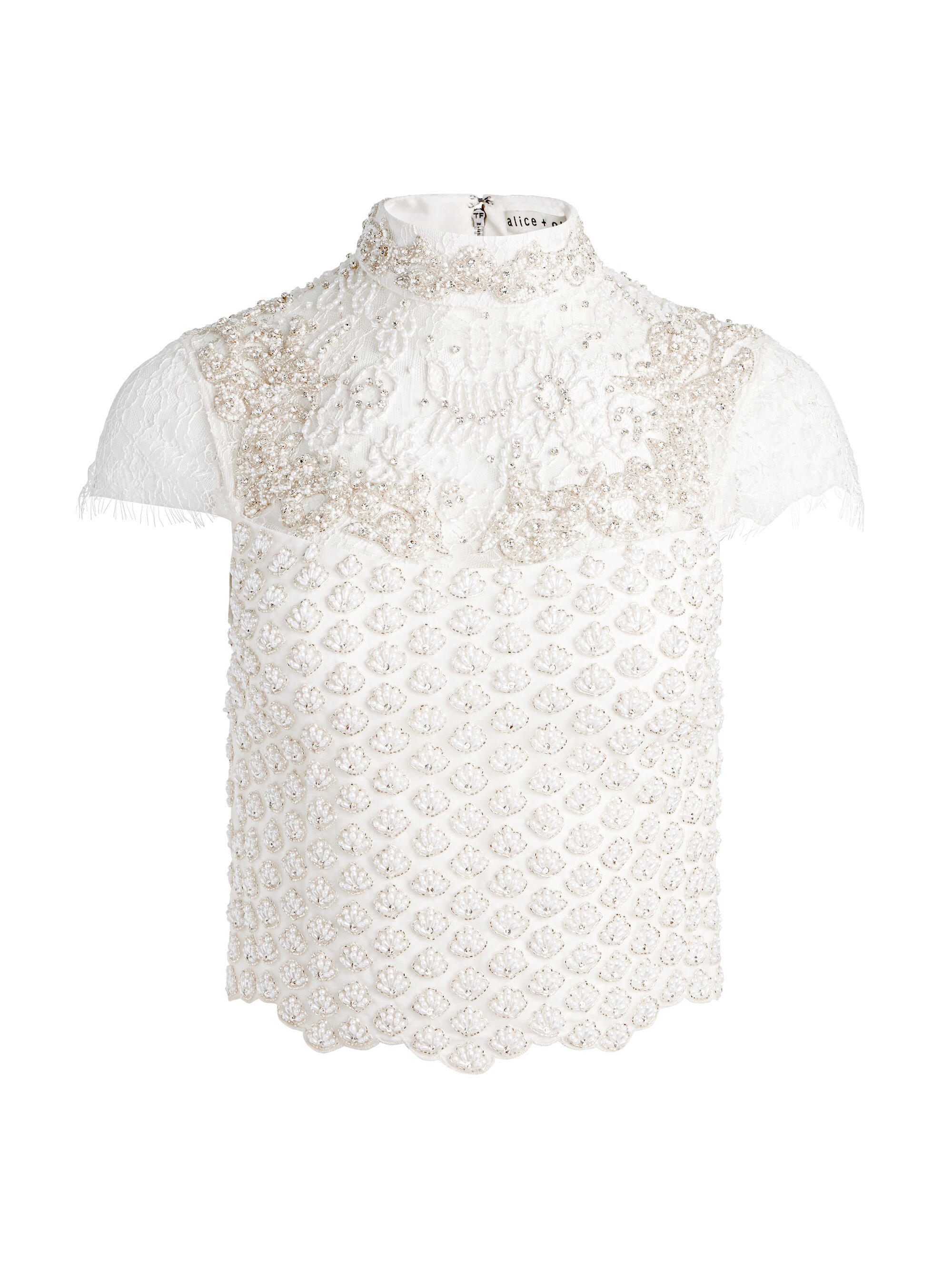 A little top, a lot of sparkle. Our Pria is back in a new iteration- now with an embellished lace finish, mock neckline, and cropped fit. The scalloped edges and allover beading make it feel unapologetically feminine, while the sheer elements add a flirty edge. Perfect with high-rise denim or a tailored pant- it’s a tiny top with big impact. DETAILS - Crop top - Embellished lace - Mock neck - Lined - Back zipper closure - 100% nylon - Dry clean only - Imported FIT - Model is 5'10" and wearing a size XS - Length from the shoulder: 18 3/4" - Fits true to size, take your normal size