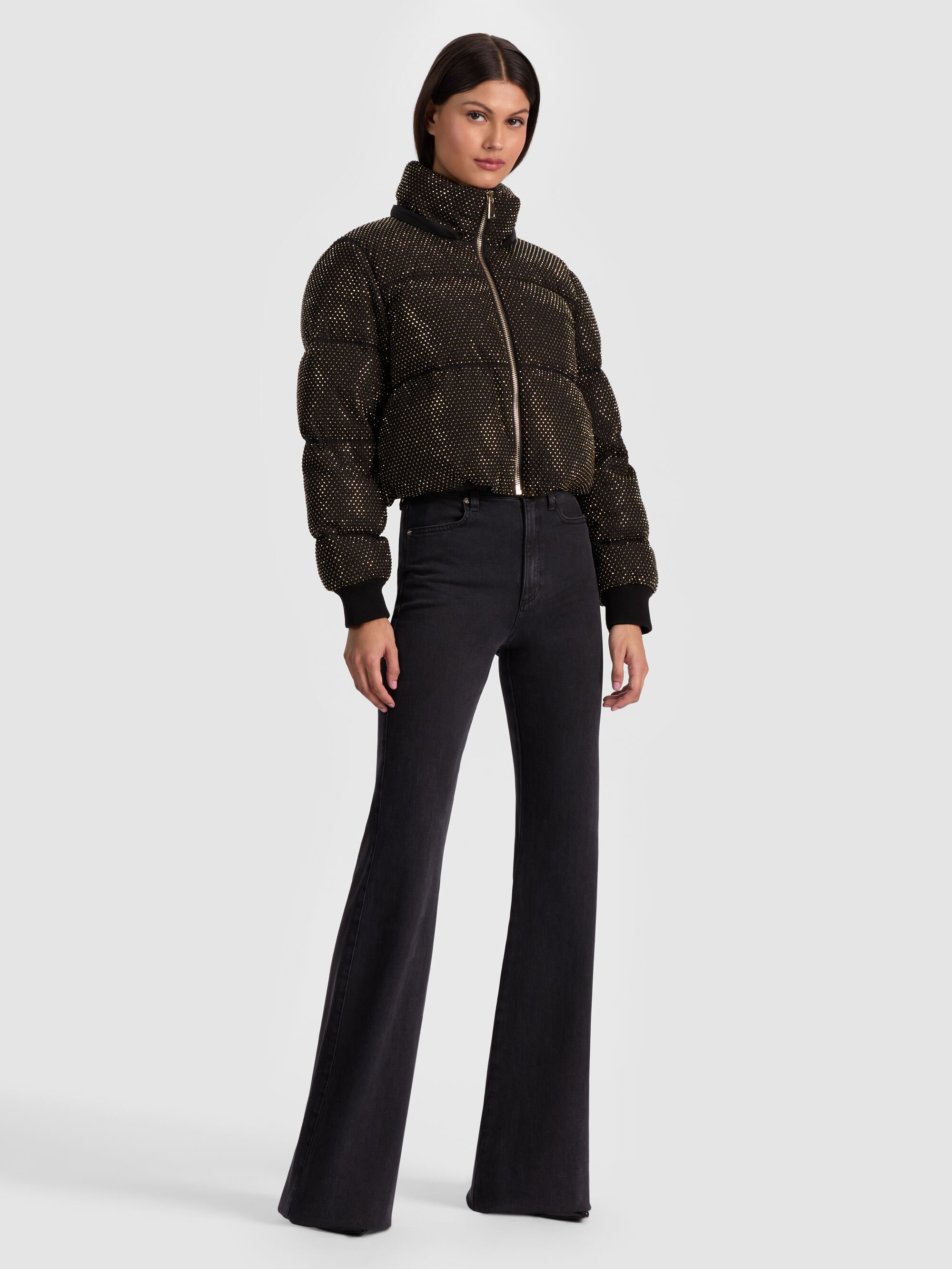 Robena turns the classic puffer into a showstopper with crystal embellishments. A removable hood gives it styling versatility, while the cozy fill ensures you’re as warm as you are glamorous. Throw it on over jeans or night-out looks when you want warmth and wow-factor in equal measure. DETAILS - Puffer jacket - Cropped - Embellished - Removable hoodie - Front zipper closure - Crystal heatset - Dry clean only - Imported FIT - Model is 5'10" and wearing a size XS - Length from the shoulder: 20" - Fits true to size, take your normal size