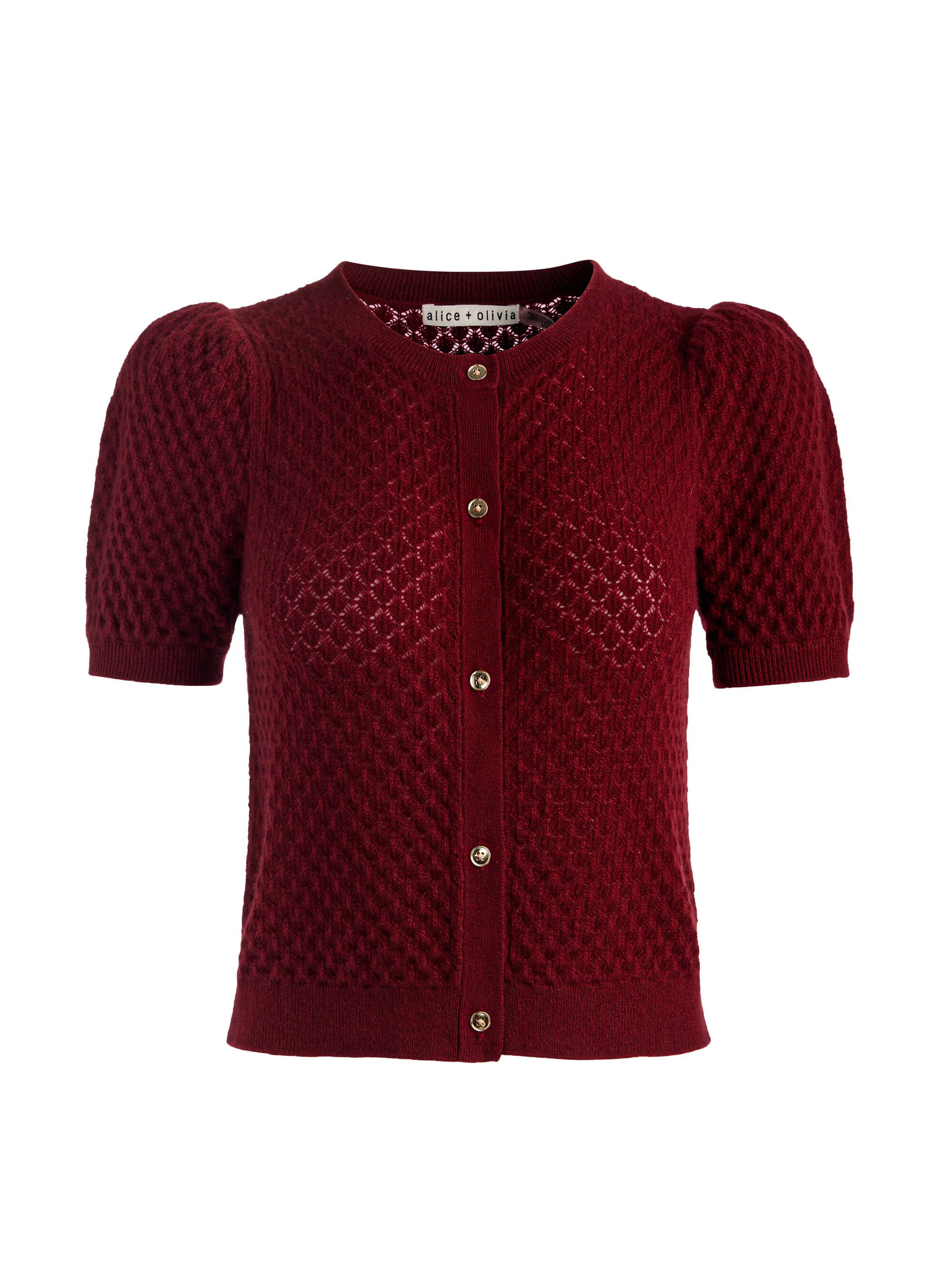 Sabine is the cropped cardigan you’ll find yourself styling a hundred ways. Knit in luxe cashmere with puff sleeves and a fitted silhouette, it has just enough detail to feel special without being fussy. The length makes it ideal over a tank or dress now, and later it slips under coats without adding bulk. Simple, versatile, and quietly indispensable, it will earn a permanent spot in your fall rotation! DETAILS - Cashmere cardigan - Pointelle stitch - Puffed sleeves - Fitted - Cropped - Front button closures - 97% cashmere, 3% nylon - Dry clean only - Imported FIT - Model is 5'10" and wearing a size XS - Length from the shoulder: 19" - Fits true to size, take your normal size