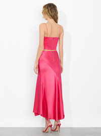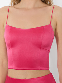 This bustier top is a sleek and modern take on a classic silhouette, offering a structured yet minimalist aesthetic. Featuring a cropped fit, it is designed with thin spaghetti straps and a fitted bodice that accentuates the waist. The contoured seams enhance the shape, while the smocked back ensures comfortable wear. A subtle sheen gives it an elevated, glamourous vibe. Perfect for layering, this top pairs effortlessly with high-waisted denim or any of our skirts. DETAILS - Bustier top - Cropped - Shiny satin toyo - Smocked back with zipper closure - 75% triacetate, 25% polyester - Dry clean only - Imported FIT - Model is 5'10" and wearing a size 2 - Length from the shoulder: 17 1/2" - Fits true to size, take your normal size
