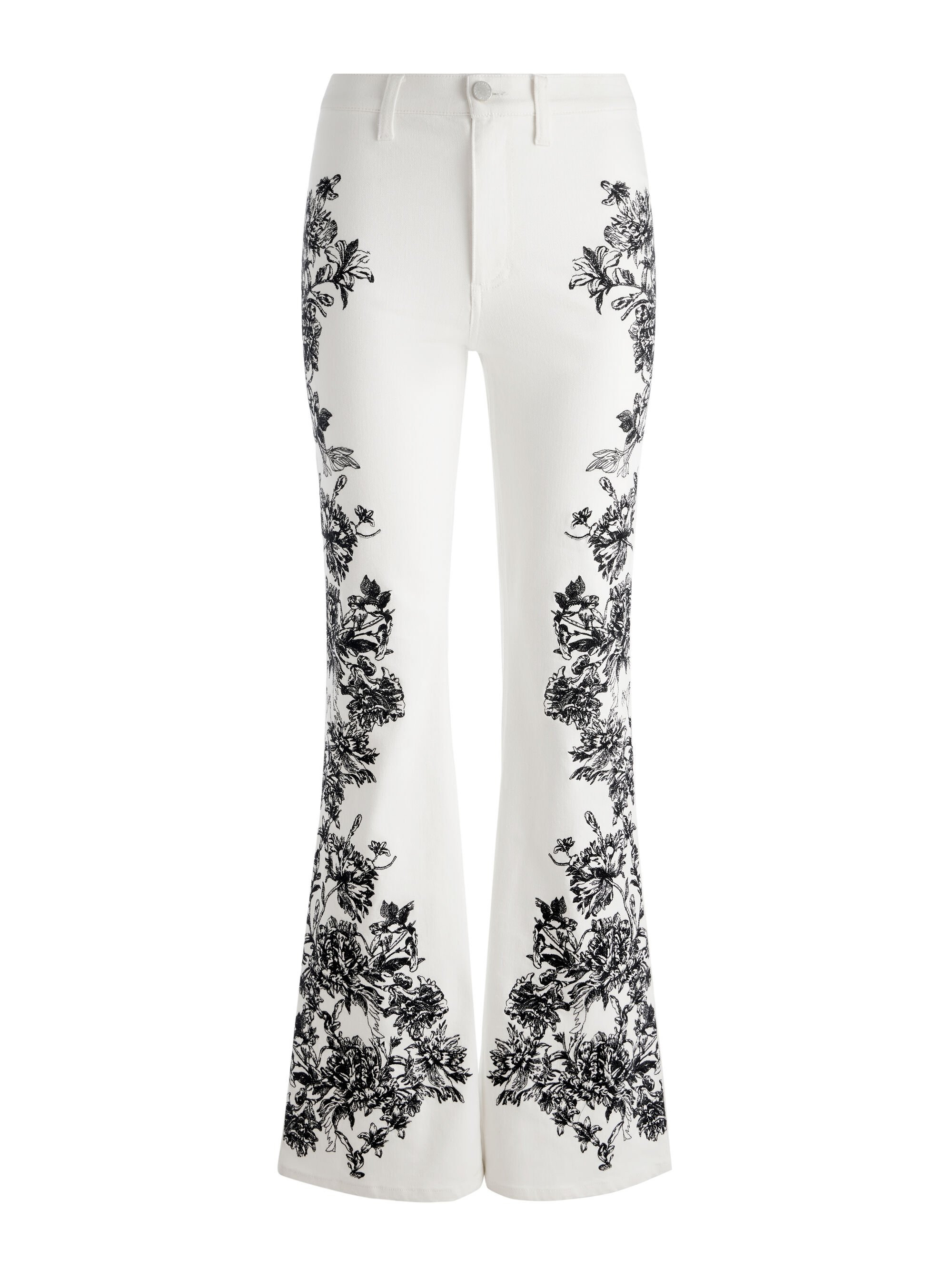 Proof your denim can do more. These high-rise flares are made from stretch cotton denim and finished with intricate black embroidery that winds around the hem. Sculpting through the hip and flared at the leg, they’re what we call maximalist casual-just add a tee or matching jacket. DETAILS - Embroidered jean - Flared leg - High rise - Front button and zipper closure - 94% cotton, 4% elastomultiester, 2% elastane - Dry clean only - Imported FIT - Model is 5'10" and wearing a size 24 - Front rise: 10 1/2" - Inseam: 34 1/2" - Fits true to size, take your normal size