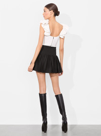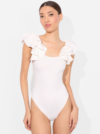 Your new go-to piece for summer. Crafted from sculpting nylon scuba, this off white bodysuit features romantic ruffled sleeves, a deep scoop neckline, and a thong snap closure for a smooth, seamless finish. Designed to contour and flatter, it hugs in all the right places while still feeling comfortable enough to wear all day. Pair it with everything from denim to full skirts- this one does the heavy lifting so you don’t have to. DETAILS - Bodysuit - Nylon scuba - Ruffled sleeves - Scoop neck - Thong bottom with snap closure - Back zipper closure - 94% nylon, 6% elastane - Dry clean only - Imported FIT - Model is 5'10" and wearing a size XS - Length from the shoulder: 23" - Fits true to size, take your normal size