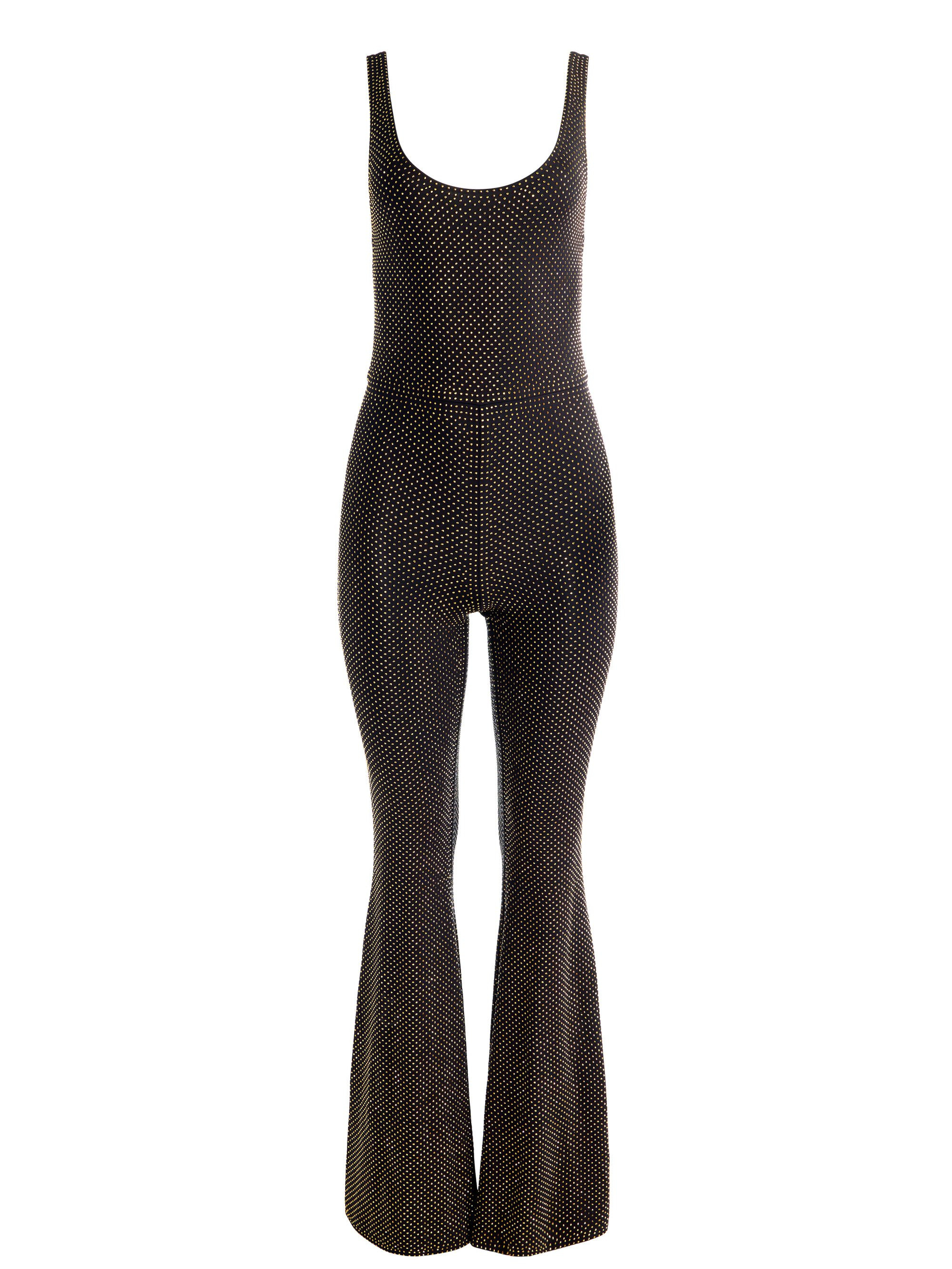 Teresa is pure ’70s fantasy, cut in jersey and drenched in crystals from neck to hem. A scoop neckline balances its elongated bell-bottom legs, creating a silhouette that’s sleek yet playful. Designed to catch the light with every move, it’s impossible not to feel like a disco goddess in this piece. Channel your inner Donna and dance the night away. DETAILS - Jumpsuit - Embellished hematite heat-set crystals on viscose jersey - Scoop neck - Bootcut leg - Back zipper closure - 96% viscose, 4% elastane - Dry clean only - Imported FIT - Model is 5'10" and wearing a size 0 - Length from the shoulder: 62" - Inseam: 35" - Fits true to size, take your normal size