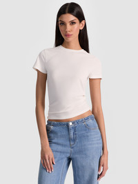 Meet your not-so-basic basic. The Tess off white baby tee is the closet essential you’ll reach for on repeat-fitted, flattering, and crafted from our ultra-soft sand-washed cupro jersey for that perfectly broken-in feel. With a classic crew neckline and full-length cut, it hugs in all the right places without feeling too tight. Wear it solo with denim or layer it under blazers, cardigans, or corsets-it does it all. Fitted; size up if you prefer a more relaxed look. DETAILS - Baby tee - Sand wash cupro jersey - Fitted - Full length - Crew neck - 64% modal, 36% polyester - Dry clean only - Imported FIT - Model is 5'10" and wearing a size XS - Length from the shoulder: 22" - Fitted, size up for a more relaxed look