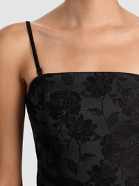 Our newest Velia is essentially two dresses in one: a jacquard mini with a subtle floral print and straps you can keep or remove. Sleek and strapless by night, chic with slim straps by day, it adapts to your mood and occasion. The fitted silhouette flatters from every angle, making it the kind of LBD that earns its place at the front of your closet season after season. DETAILS - Mini dress - Floral textured jacquard - Detachable straps - A-line - Sleeveless - Smocked back with zipper closure - 44% acetate, 35% polyester, 18% nylon, 3% elastane - Dry clean only - Imported FIT - Model is 5'10" and wearing a size 0 - Length from the shoulder: 33" - Fits true to size, take your normal size