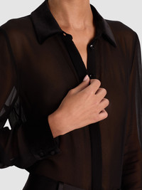 The Willa: our signature, best-selling blouse body that everyone loves--for good reason. This season's update is crafted in a sheer viscose georgette with a contrasting velvet collar and cuffs. Finished with a hidden placket for a clean look, it's polished enough for dinners out and easygoing enough for daytime strolls. Wear it tucked into denim or layered under a blazer--it's the kind of top that can do it all. DETAILS - Button down blouse - Sheer viscose georgette - Stretch velvet collar and cuffs - Hidden placket - Front button closures - 100% viscose - Dry clean only - Imported FIT - Model is 5'10" and wearing a size XS - Length from the shoulder: 24 1/2" - Fits true to size, take your normal size